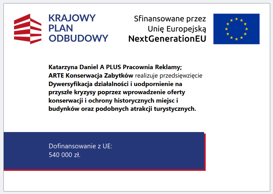 Szanowni Państwo firma A PLUS Pracownia Reklamy, ARTE Konserwacja Zabytków od dwóch dekad profesjonalnie zajmuje się szeroko rozumianą działalnością Marketingową i Reklamową oraz Konserwacją Zabytków.